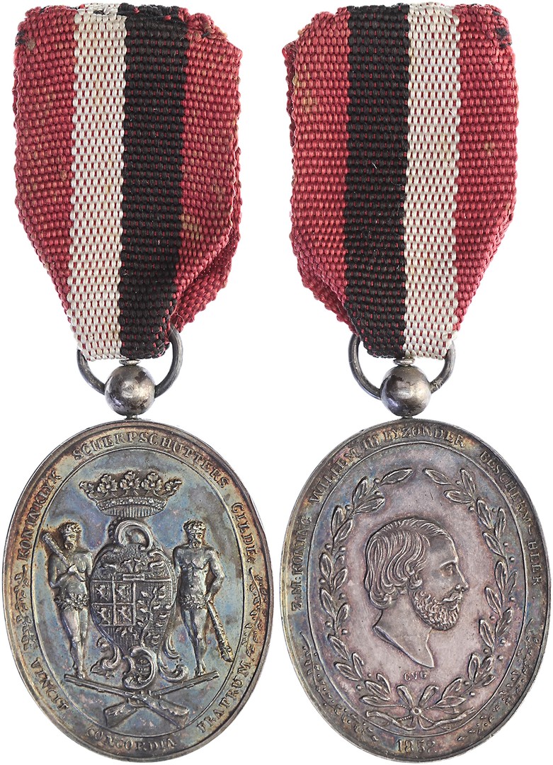 1852 Draagpenning van het Koninklijk Scherpschuttersgilde ‘Vincit Concordia Fratrum’. Aan een lintje een fraaie penning. Borstbeeld van Willem III naar rechts. / Gekroond wapen van ’s-Hertogenbosch. AR afm. 35 x 27,5. Met draagbolletje ringetje en lint. Dirks 725. Prachtig.