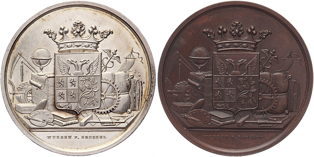 Lot (2) 1857 Eerste Provinciale Tentoonstelling van Nyverheid te ’s-Hertogenbosch gehouden. Het gekroonde wapen van ’s-Hertogenbosch. / Zevenregelige tekst. Æ en AR 41,5. Dirks 786. F. Wurden uit Brussel. Prachtig.