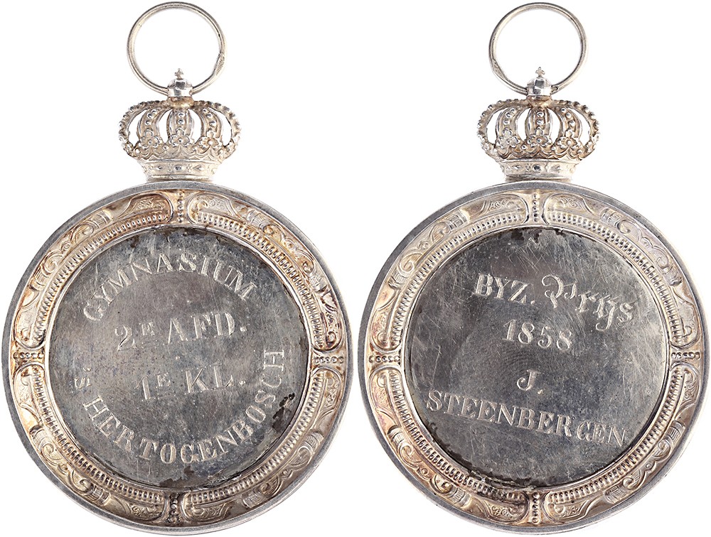 1858 Beloningspenning (vermoedelijk) door de Stad ’s-Hertogenbosch ter beschikking gesteld. Zeer fraaie penning met brede rand met ornamenten en vierregelige tekst. / Vierregelige tekst op naam van J. Steenbergen. Met draagoog. AR 51,5. Zeer fraai.