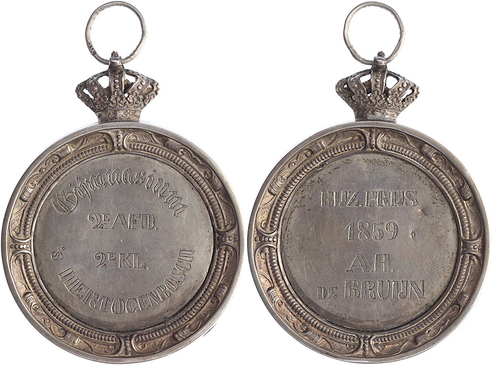 1859 Beloningspenning (vermoedelijk) door de Stad ’s-Hertogenbosch ter beschikking gesteld. Zeer fraaie penning met brede rand met ornamenten en vierregelige tekst. / Vierregelige tekst op naam van A.H. de Bruijn. Met draagoog. AR 51,5. Zeer fraai.