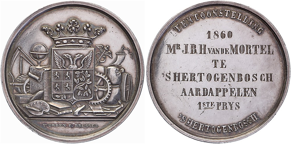 1860 Beloningspenning van de Noord-Brabantse Maatschappy ter bevordering van Nyverheid, afdeling ’s-Hertogenbosch. Het gekroond wapen van ’s-Hertogenbosch. / Achtregelige tekst 1e prijs J.B.H. van de Mortel ‘ Aardappelen’. AR 42. Dirks 786. F. Wurden uit Brussel. Prachtig.