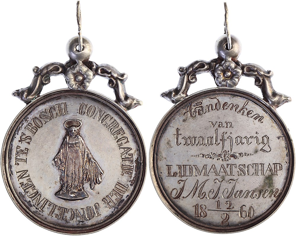 1860 Aandenken 12-jarig Lidmaatschap Congregatie der Jongelingen te ’s-Hertogenbosch. Heilige Maagd Maria. / Zesregelige tekst op naam van J.M.J. Jansen. AR 45. Met draagoog. Zeer fraai / Prachtig.