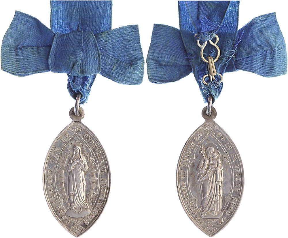 1866 Oprichting Congregatie van de Onbevlekte Ontvangenis van de Maagd Maria in de parochie van St. Pieter te ’s-Hertogenbosch. Maagd Maria omgeven door stralenkrans. / Heilige Jozef staande met het kindeke Jezus op linkerarm. AR ovaal 45,5 x 28. Zwierzina 82. Met oog en ring en daaraan een blauw draaglint. Prachtig.