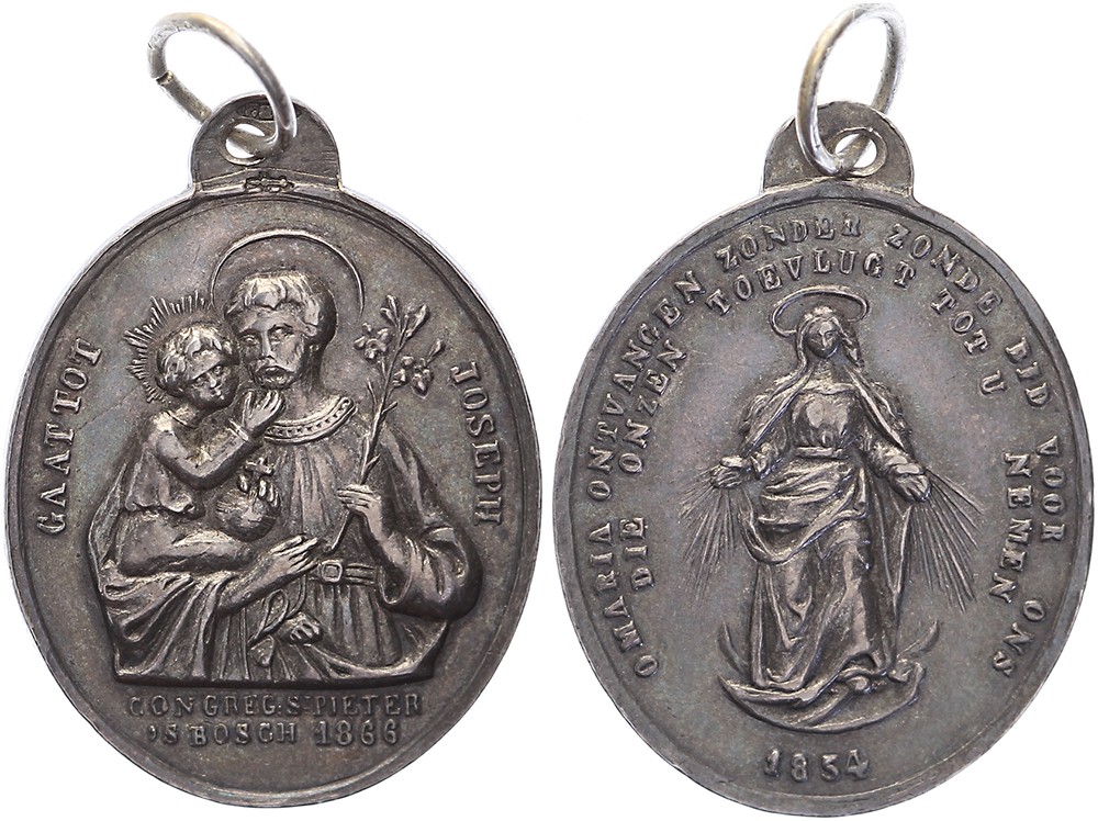 1866 Oprichting Congregatie van de Onbevlekte Ontvangenis van de Maagd Maria in de parochie van St. Pieter te ’s-Hertogenbosch. Heilige Jozef met kind op de arm. / Maagd Maria met stralenschietende handen. AR 28,5 x 24,5. Zwierzina 84. Met draagoog en ringetje. Zeer fraai.