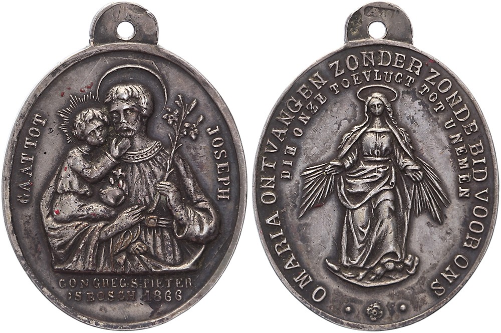 1866 Oprichting Congregatie van de Onbevlekte Ontvangenis van de Maagd Maria in de parochie van St. Pieter te ’s-Hertogenbosch. Maagd Maria met stralenschietende handen. / Heilige Jozef met kind op de arm. Met opzet voor- en keerzijde verwisseld; het gaat hier om een oprichting van een Congregatie van de Maagd Maria. AR ovaal 28,5 x 24,5. Zwierzina 83. Met draagoog. Zeer fraai.