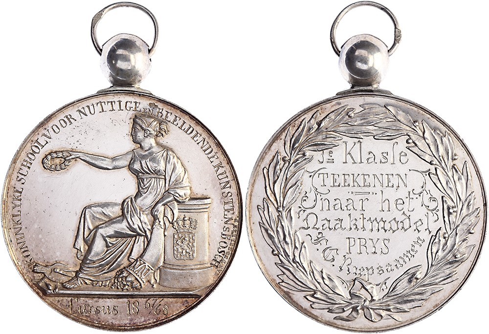 1867/1868 Beloningspenning van de Koninklijke School van Nuttige en Beeldende Kunsten te ’s-Hertogenbosch. Weelderig geklede vrouw zittend in een kolom met daarop het wapen van Noord-Brabant. / Lauwerkrans rondom met daarin zesregelige tekst: 1e prijs F.G. Riepsaamen. AR 50,5. Met draagoog en ring. F. Van der Kellen. Zeer fraai.