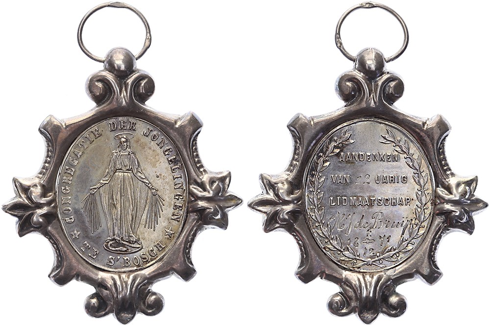 1871 Penning op het Twaalfjarig Lidmaatschap der Jongelingen Congregatie te ’s-Hertogenbosch. Maagd Maria stralenschietende handen. / Lauwerkrans rondom met daarin vijfregelige tekst op naam van H.J. de Bruijn. AR ovaal 44 x 38,5. Zwierzina 199. Zeer fraai / Prachtig.