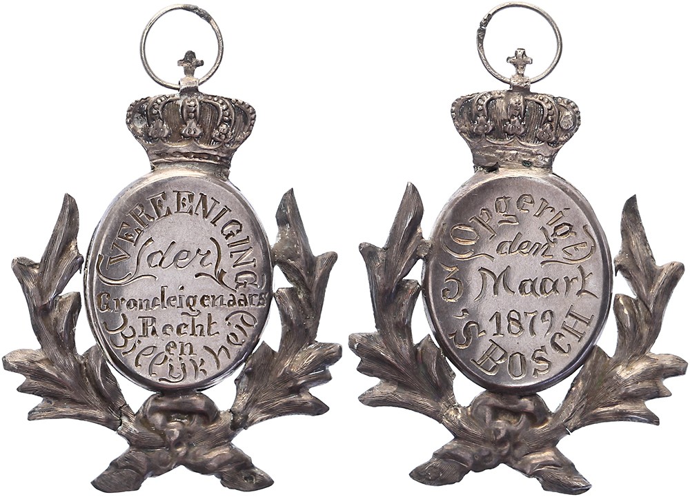 1879 Penning van de Vereeniging der Grondeigenaren te ’s-Hertogenbosch. Gekroonde penning met kruisje en zesregelige tekst (in samengebonden lauwertakken). / Vijfregelige tekst. AR ovaal 46 x 34. Met draagoogje. Zeer fraai.