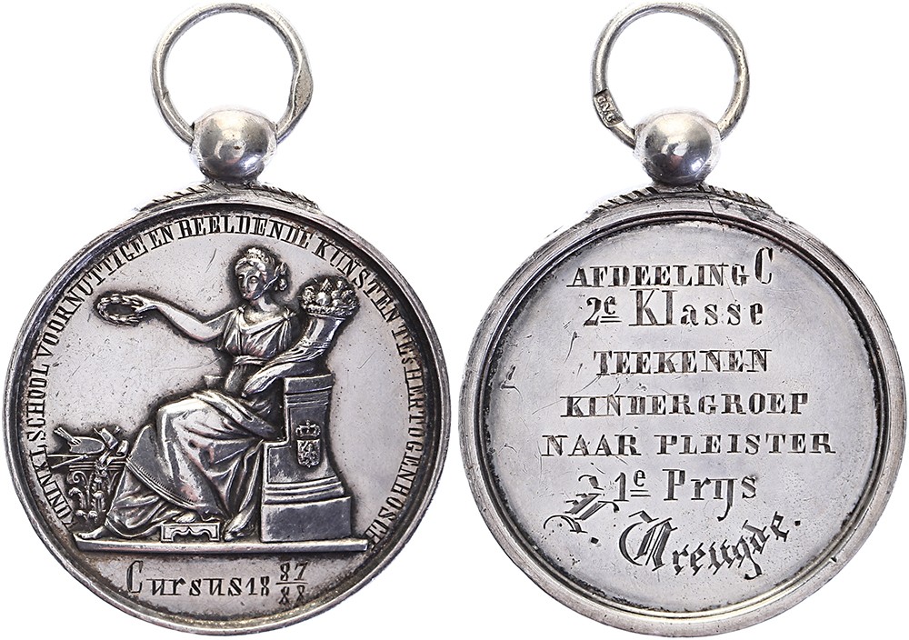 1887/1888 Beloningspenning uitgeloofd door de Koninklijke School voor Nuttige en Beeldende Kunsten te ’s-Hertogenbosch. De Kunst – voorgesteld door een schone, in Grieks gewaad geklede vrouw. / Zevenregelige tekst: 1e prijs H. Vreugde. AR 39. Dirks 680. Van der Kellen. Met knopje en draagring. Zeer fraai.