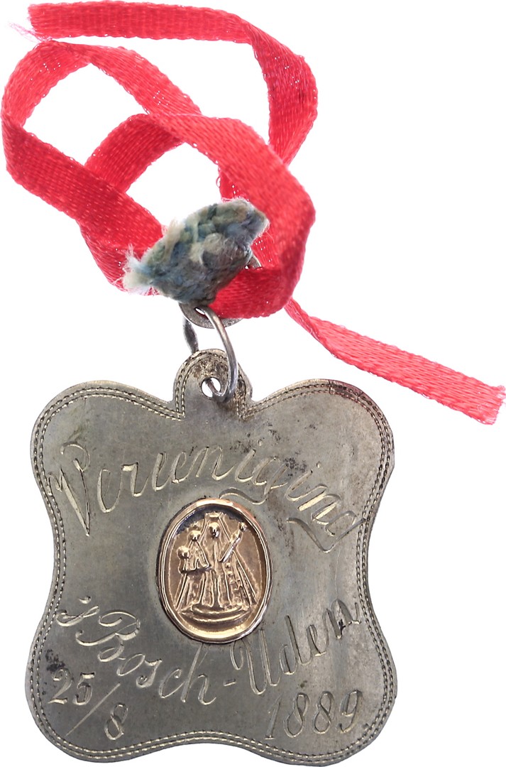 1889 Bedevaartspenning (vermoedelijk) van ’s-Hertogenbosch naar Uden, O.L.Vr. ter Linde. Rondom voorzien van fijn dubbel stippellijntje met in midden afbeelding van Maria-beeld in goud en drieregelige tekst. Penning is eenzijdig en zeer dun. Koper of messing 26,5 x 26,5. Met draagoog en lintje. Prachtig.