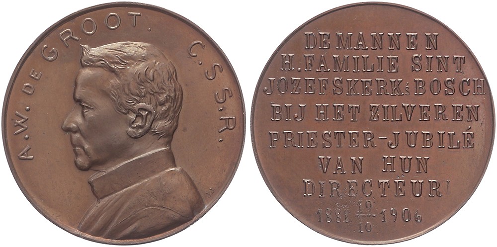 1906 Het 25-jarig Priester Jubileum van Pater Redemptorist A.W. de Groot te ’s-Hertogenbosch. Borstbeeld Pater De Groot naar links met omschrift. / Achtregelige tekst. Æ 37. Zwierzina 659.In brons zijn er maar 12 exemplaren geslagen. Prachtig.