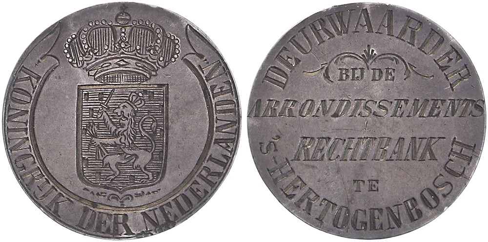1910 Deurwaarder bij de Arrondissements Rechtbak te ’s-Hertogenbosch. Gegraveerd gekroond Rijkswapen van het Koninkrijk der Nederlanden. / Zesregelige tekst. AR 29. Zeldzaam! Zeer fraai. N.B. Ex veiling 14 Laurens Schulman, april 1995, kavel 2098