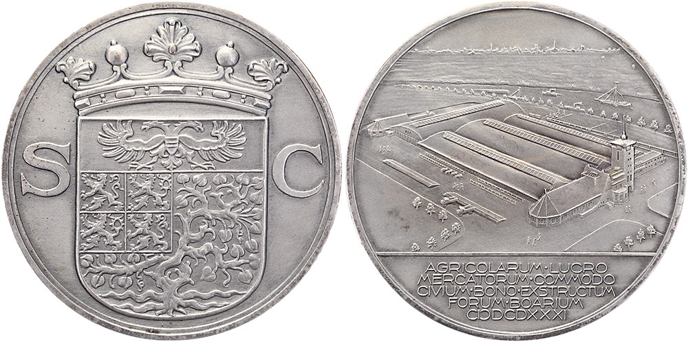 1931 Penning is uitgegeven bij de opening van de Veemarkthallen te ’s-Hertogenbosch. Gekroond wapen van ’s-Hertogenbosch. / Pas geopende Veemarkthallen in vogelvlucht met in afsnede vijfregelige tekst. Verzilverd of AR 60. KB III-500. J.J. van Goor. Prachtig.