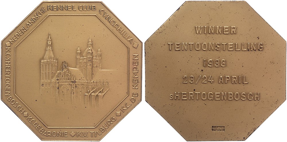 1938 Hondententoonstelling van de Nederlandse Kennel Club Cynophilia. Sint-Jan met omschrift. / Vijfregelige tekst. Koper 50, achthoekig. KB V-1177. M.P.J. Fleur. Zeer fraai.