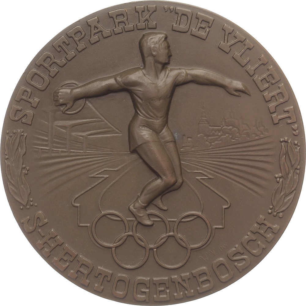 1951 Penning uitgegeven bij de opening van het Sportpark ‘ De Vliert’. Discuswerper. / Enkel randversiering, veld niet ingevuld. Koper 65. KB V-1994. M. Kutterink. Prachtig.