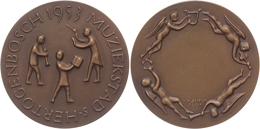 1953 ’s-Hertogenbosch Muziekstad. Drie figuren; fluitspeler, zanger en dirigent. / Vier engelen met muziekinstrumenten. Æ 70. KB V-2081. F. v.d. Burgt. Prachtig.