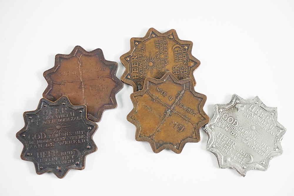 Lot (5) 1958 Godspenningen geslagen in opdracht van het Nederlands Rooms Katholieke Huisvestings Comité. Voorzijde met 11 punten met tekst. / In vier vakken verdeeld door prikkeldraad. Verschillende varianten 39,5. Geurt Brinkgreve. Zeer fraai.