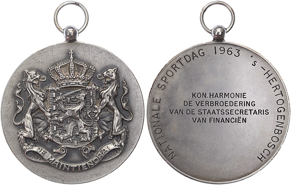 1963 Nationale Sportdag 1963 te ’s-Hertogenbosch gehouden (door Staatsecretaris van Financiën ter beschikking gesteld). Wapen van Nederland. / Omschrift en vierregelige tekst.AR 53. Met draagoog en draagringetje. Zeer fraai.