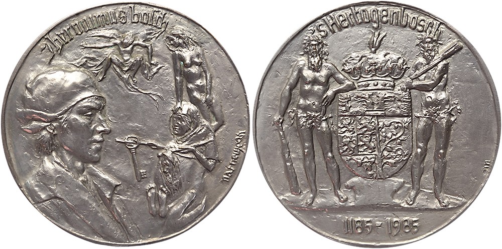 1985 Hommage aan Jeroen Bosch geslagen t.g.v. 800-jarig bestaan van ’s-Hertogenbosch. Jheronimus van Aken met vrouw die hem een sleutel aanbiedt. / Wapen van ’s-Hertogenbosch tussen twee Wildemannen. Æ Verzilverd 70,5. Nat Neujean. Prachtig.