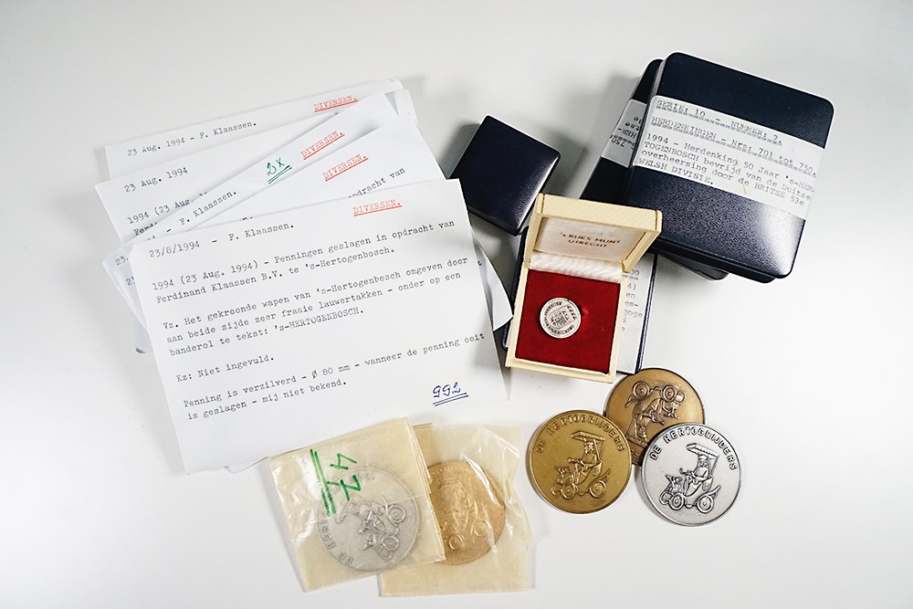 Koekblik met vnl. penningen geslagen in 1994 in opdracht van Ferdinand Klaassen BV te ’s-Hertogenbosch