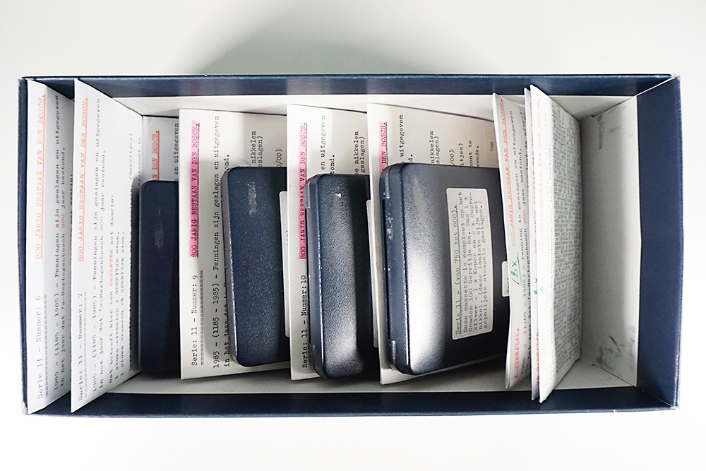 Doos met groot lot “Gerritjes” geslagen t.g.v. het 800 jarig bestaan van ’s-Hertogenbosch. Cupro-nikkel, brons en zilver oftewel 1, 2½ en 10 Gerritje deels in cassette.