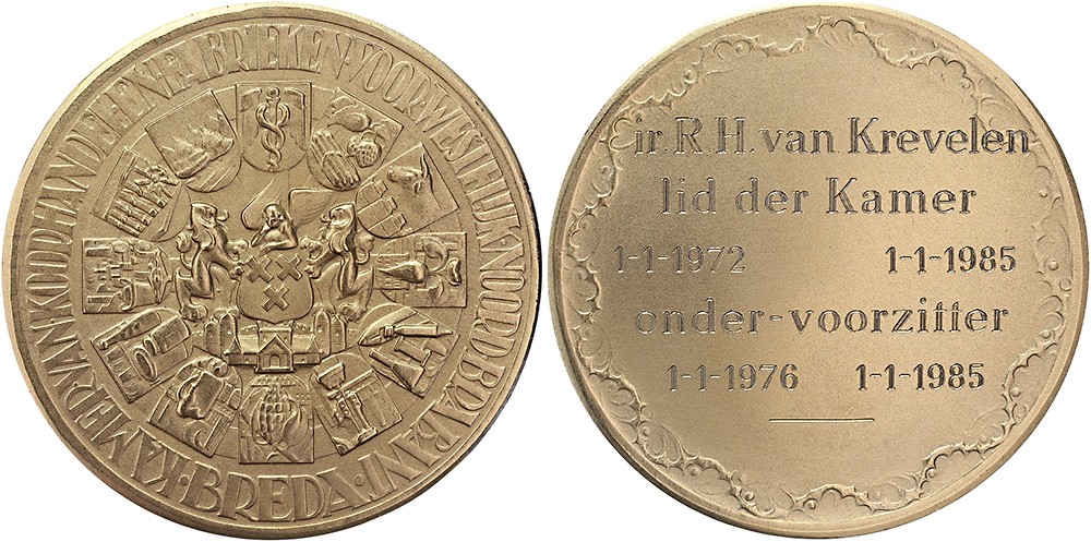 (1930) Breda. Erepenning Kamer van Koophandel en Fabrieken voor westelijk Noord-Brabant. Stadswapen van Breda omringd door 12 schilden met ambachten. / Inscriptieruimte binnen hulstkrans. Op naam van: IR. R.H. VAN KREVELEN 1985, lid- en ondervoorzitter. AR verguld 60 [83,31 gram], KB III-462; vgl. Jintes/Pol 462. Prachtig.