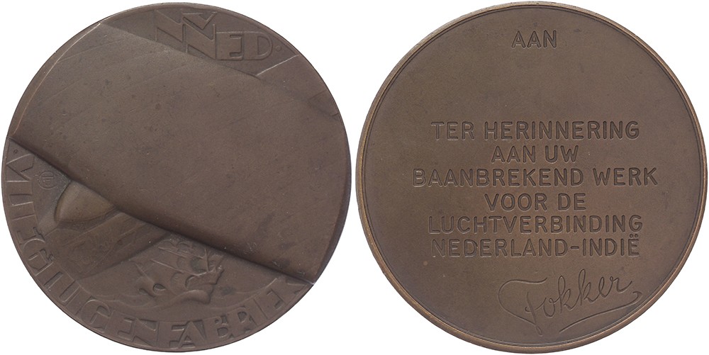 (1930) Dankpenning N.V. Nederlandsche Vliegtuigenfabriek Fokker / luchtverbinding Nederland – Indië. Vliegtuig, van bovenaf gezien, boven zeilschip. / Zevenregelig opschrift (incuus); handtekening Fokker. Æ 60, KB III-475; Jintes/Pol 239. Prachtig.N.B. Jintes/Pol vermelden dat zij deze penning nergens hebben aangetroffen; een afbeelding ontbreekt derhalve in hun boek.