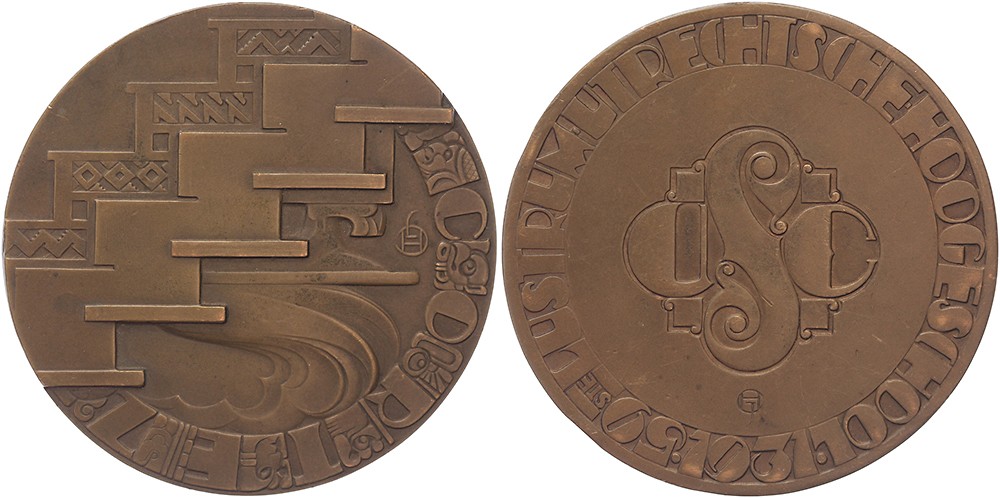 1931 Utrecht, 59e Lustrum universiteit: thema Cortez. Trap met Inca motieven. / Monogram Utrechtsch Studenten Corps. Æ 60. KB III-515; Hofstee 29; Jintes/Pol 248. Prachtig.