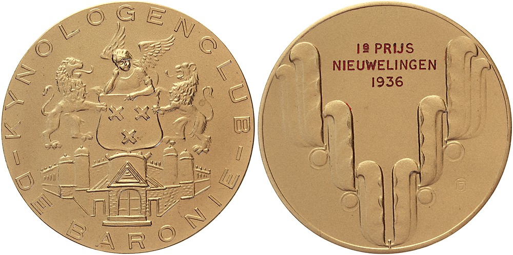 (1936) Breda. Prijspenning kynologenclub Breda. Wapen van Breda gehouden door twee leeuwen. / Inscriptieruimte tussen gestileerde veren (met logo van Van der Hoef en inscriptie).Æ verguld 40. KB V-1059. Prachtig / FDC.