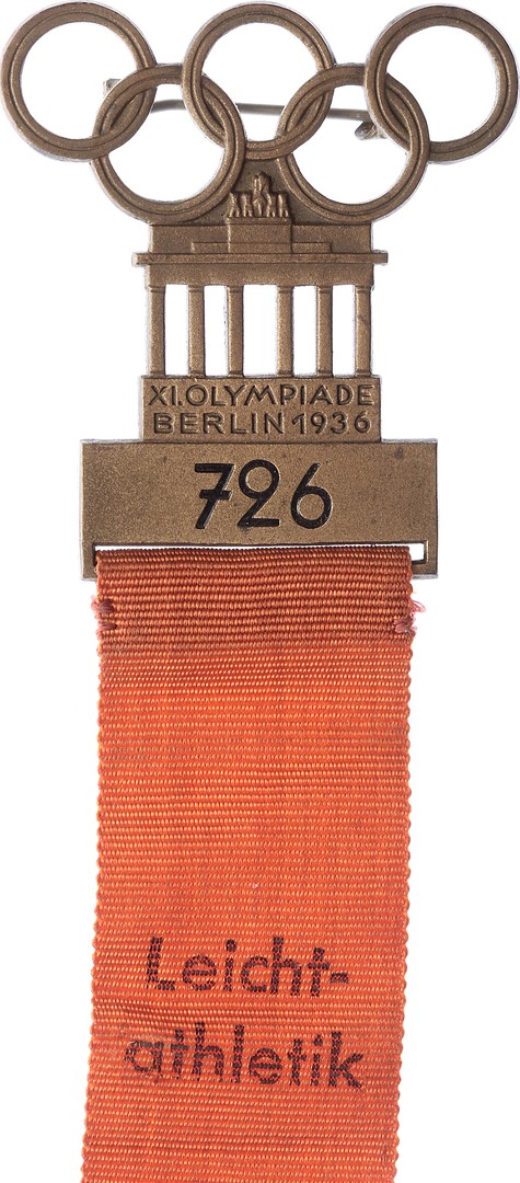 1936 Berlin. Official badge for participants ‘Leichtathletik’. Olympic rings above Brandenburg Gate. Orange ribbon. Æ 46 x 42. Gad./Vesc. page 107, nr. 104 var. EF.