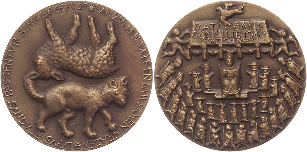 1962 Tweede Vatikaans concilie. Bisschoppen en kardinalen rondom paus. / Wolf en lam.Æ 65. KB VI-2766; Van der Kam P6201. Prachtig.