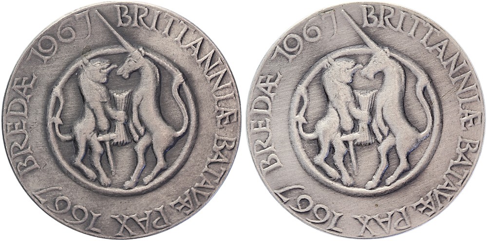Lot (2) 1967 Vrede van Breda. Staande leeuw (= de 7 Provinciën) en eenhoorn (= Groot-Brittannië) in cirkel. / Zeilschepen rondom wapen van Breda. AR 30. KB VI-3341; Van der Kam P6703. Prachtig.