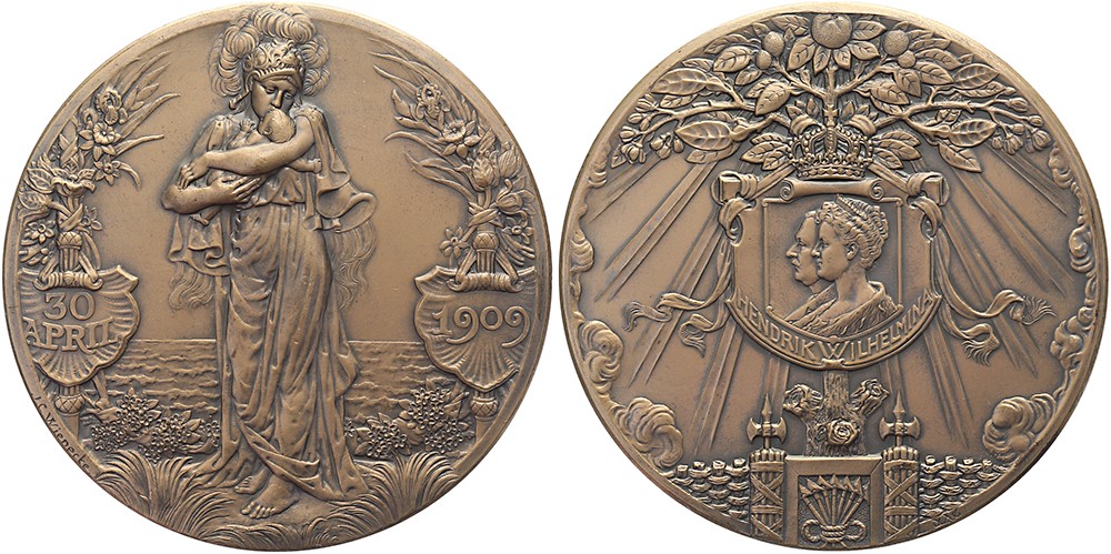 1909 Geboorte prinses Juliana. Staande Nederlandse maagd met baby in haar armen. / Wapenschild in oranjeboom met borstbeeldjes Wilhelmina & Hendrik. Æ 65. JMP 1954, pag. 29, nr. 1. Prachtig.
