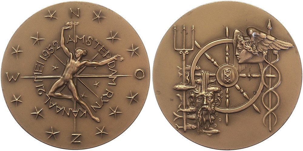1952 Opening Amsterdam-Rijnkanaal.  Naakte mannenfiguur boven windwijzer. / Stuurrad, mercuriusstaf, drietand, Neptunus, vissen enz. Æ 60 mm. KB V-2014. (Fred. Carasso. )Prachtig.