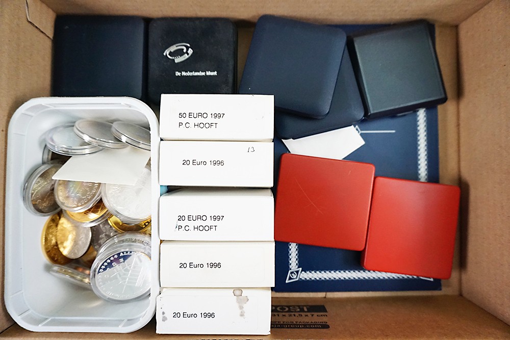 Doos met nep-écu’s en nep-euro’s. Enig zilver.