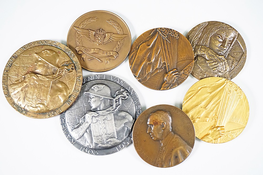 Sigarenkistje (7) grootformaat Belgische penningen, w.o. 2 x KvK Antwerpen (Arthur Dupon).