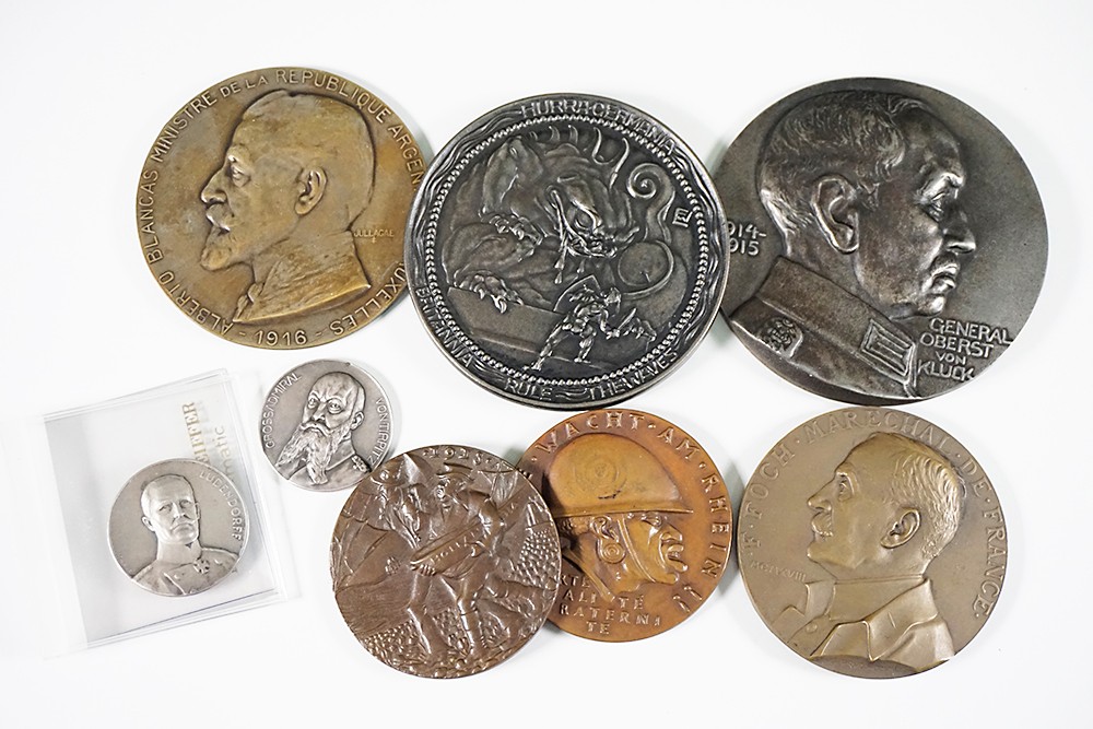 1914-1918. Mooi lot van 8 penningen, allen betrekking hebbende op de periode 1914-1918 danwel WO I; o.a. Churchill, General Oberst von Kluck, Die Schwarze Schande, General Ludendorff etc. Moet gezien worden! Æ en AR.