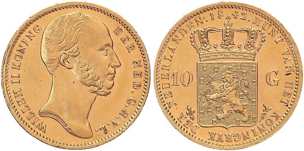 10 Gulden 1842 mmt. lelie Sch. 502. Met gepolijste stempels geslagen Prachtig / FDC