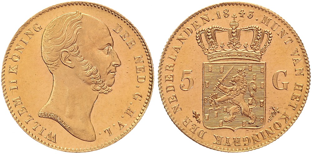 5 Gulden 1843 mmt. lelie Sch. 503. Met gepolijste stempels geslagen Vrijwel FDC