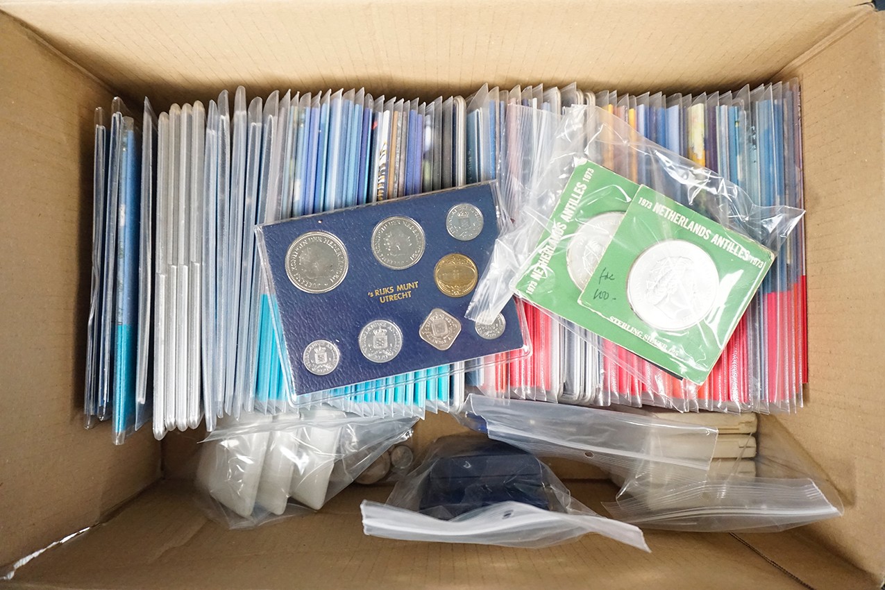 Doos Antillen / Aruba; o.a. 65 x FDC-sets uit de 20e / 21e eeuw, 15 zilveren herdenkingsmunten, enz.