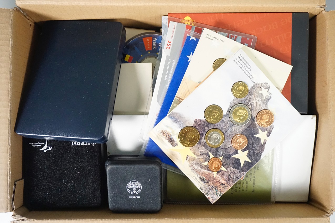 Bruine doos met allerlei sets (o.a. KNM, NMB/ING), ook zilveren dukaten (1989), penningen etc.