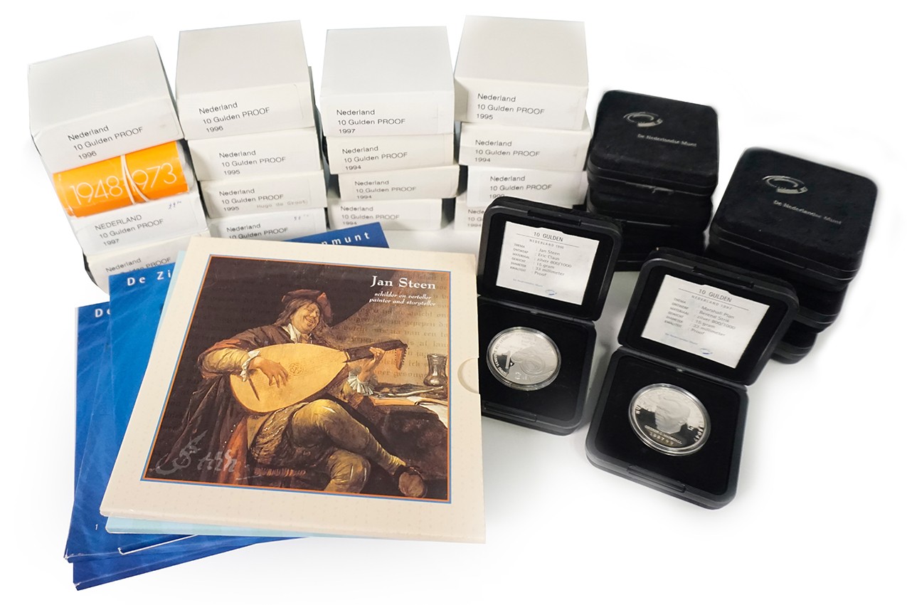 Doosje (29) 10 Guldenmunten 1973-1999 in FDC & proof. Allen in originele verpakking. Netto zilver: 351 gram.