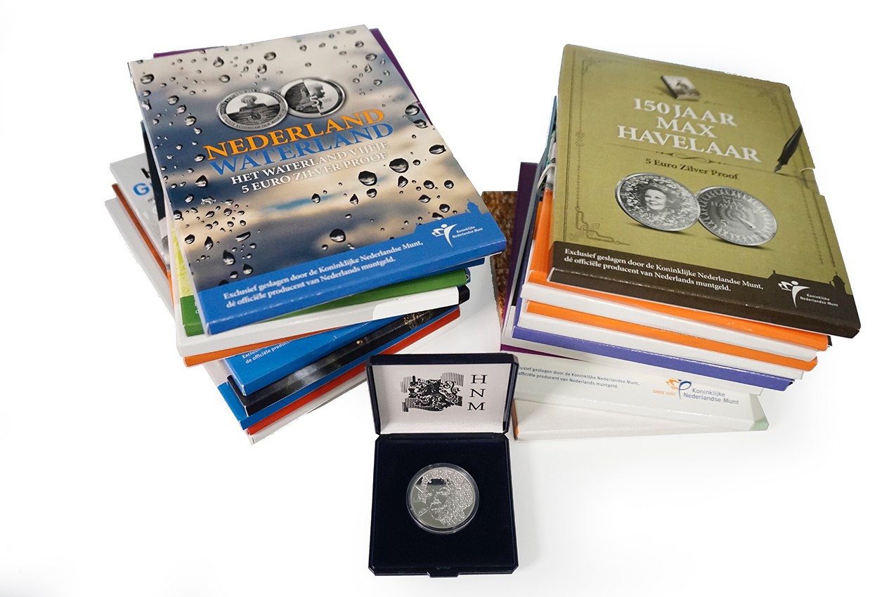 Doos met 18 stuks 5 euro zilveren proof. Vrijwel allen verschillend! Alsmede 5x 10 Euro proof.