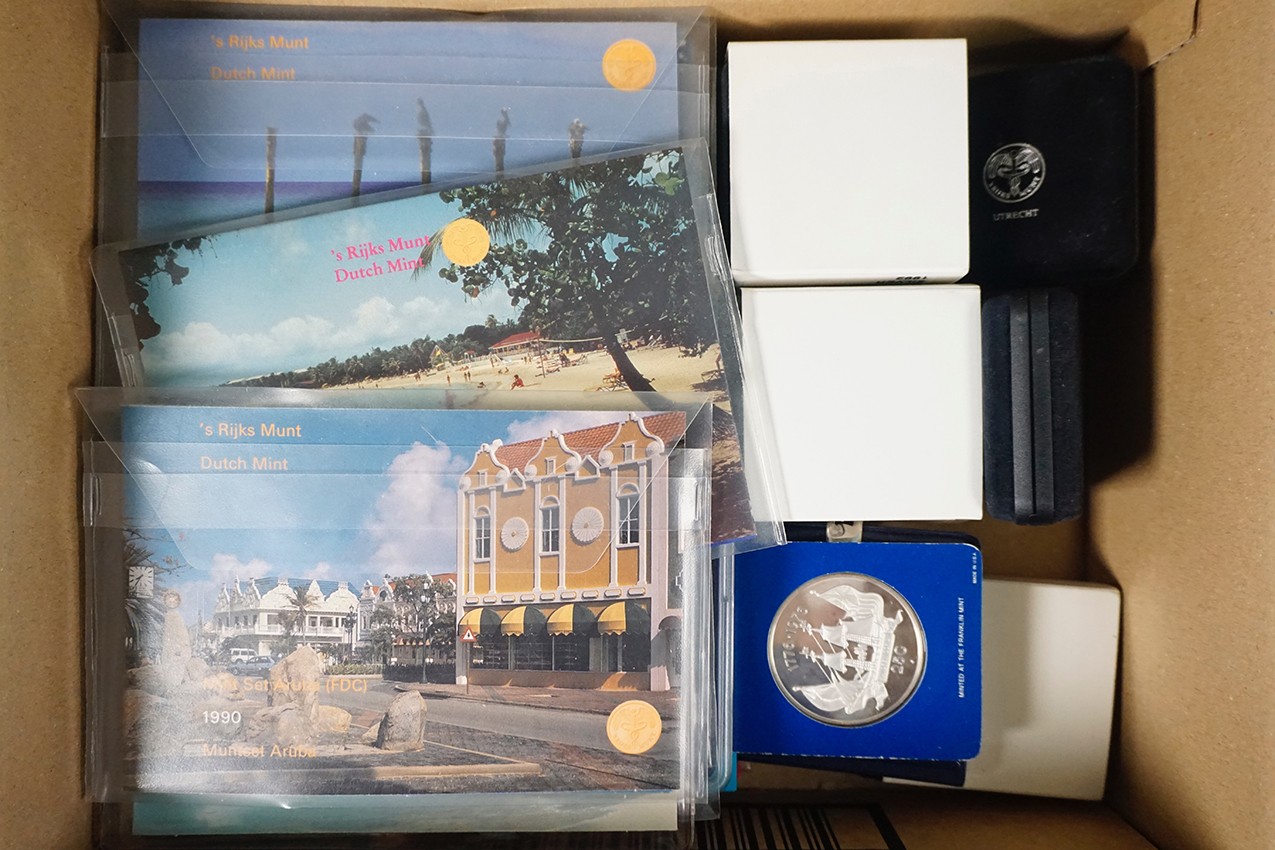 Doosje Ned. Antillen/Aruba met 28 x FDC-sets en 9 x zilveren herdenkingsmunt.