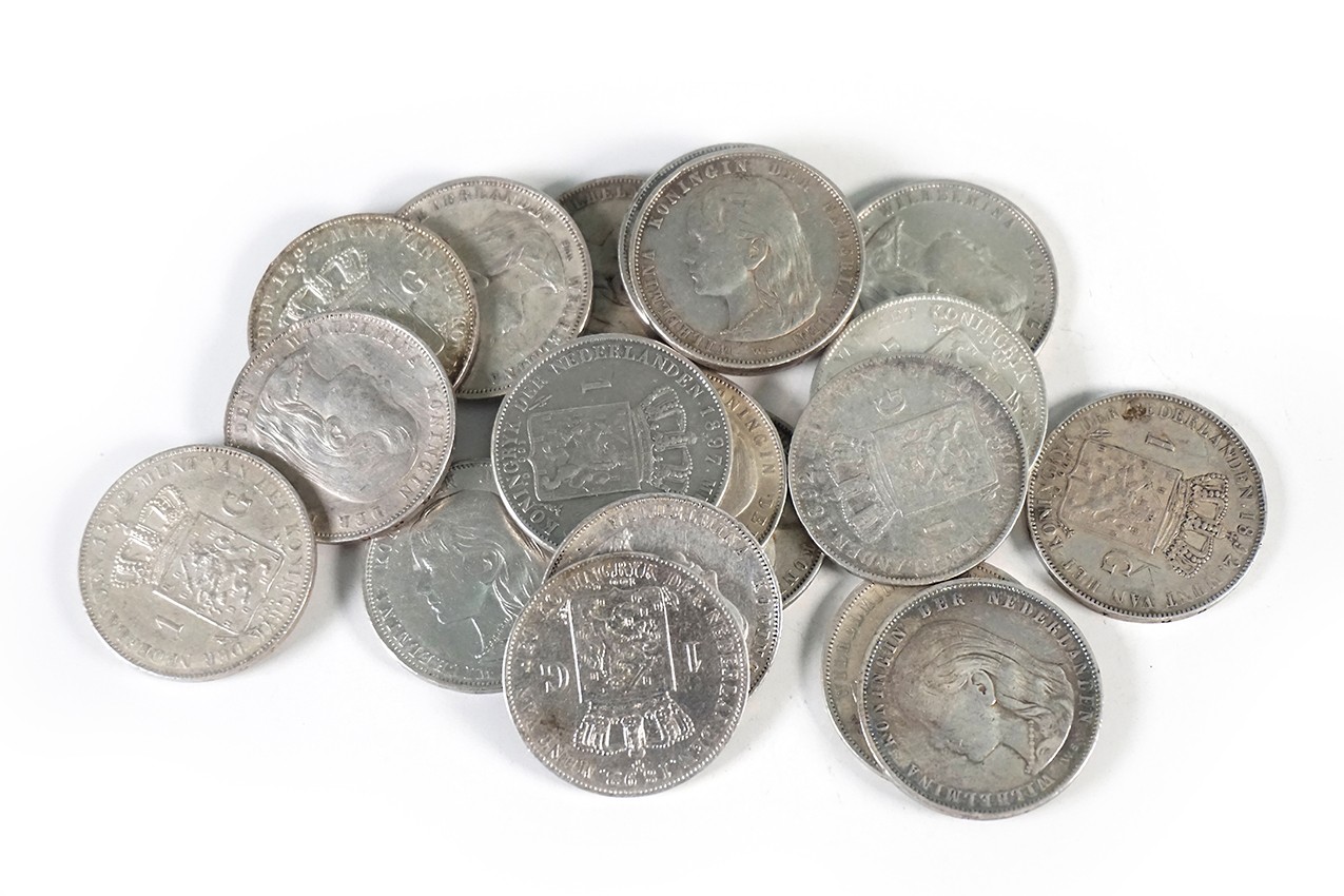 La Paz-doosje met 20 stuks 1 gulden Wilhelmina ‘hangend haar’; 1892 (15) en 1897 (5). Diverse kwaliteiten.