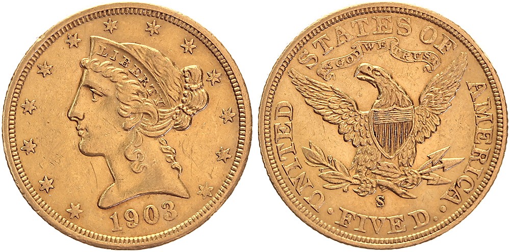 5 Dollars 1903S Coronet Head. Fr. 145; KM 101. EF.