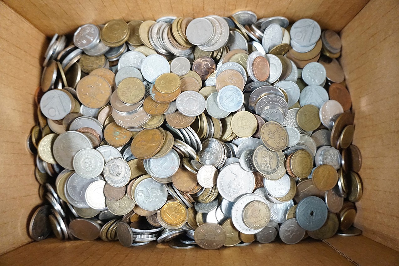 Doos met eenvoudig kilogoed wereld, ca. 10 kilo.