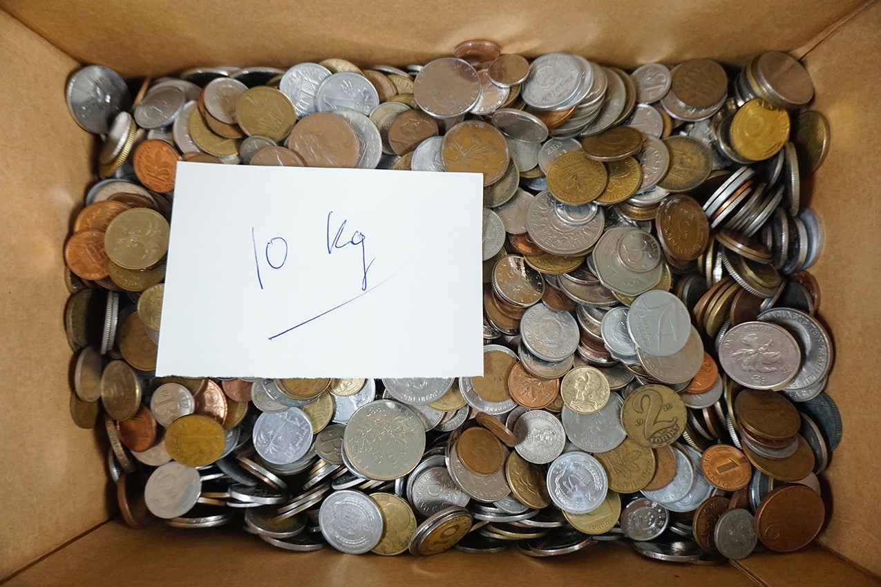 Doos met eenvoudig kilogoed wereld, ca. 10 kilo.