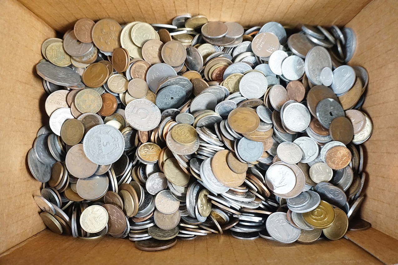 Stevige kartonnen doos met ruim 10 kg. eenvoudige wereldmunten; kilowaar.