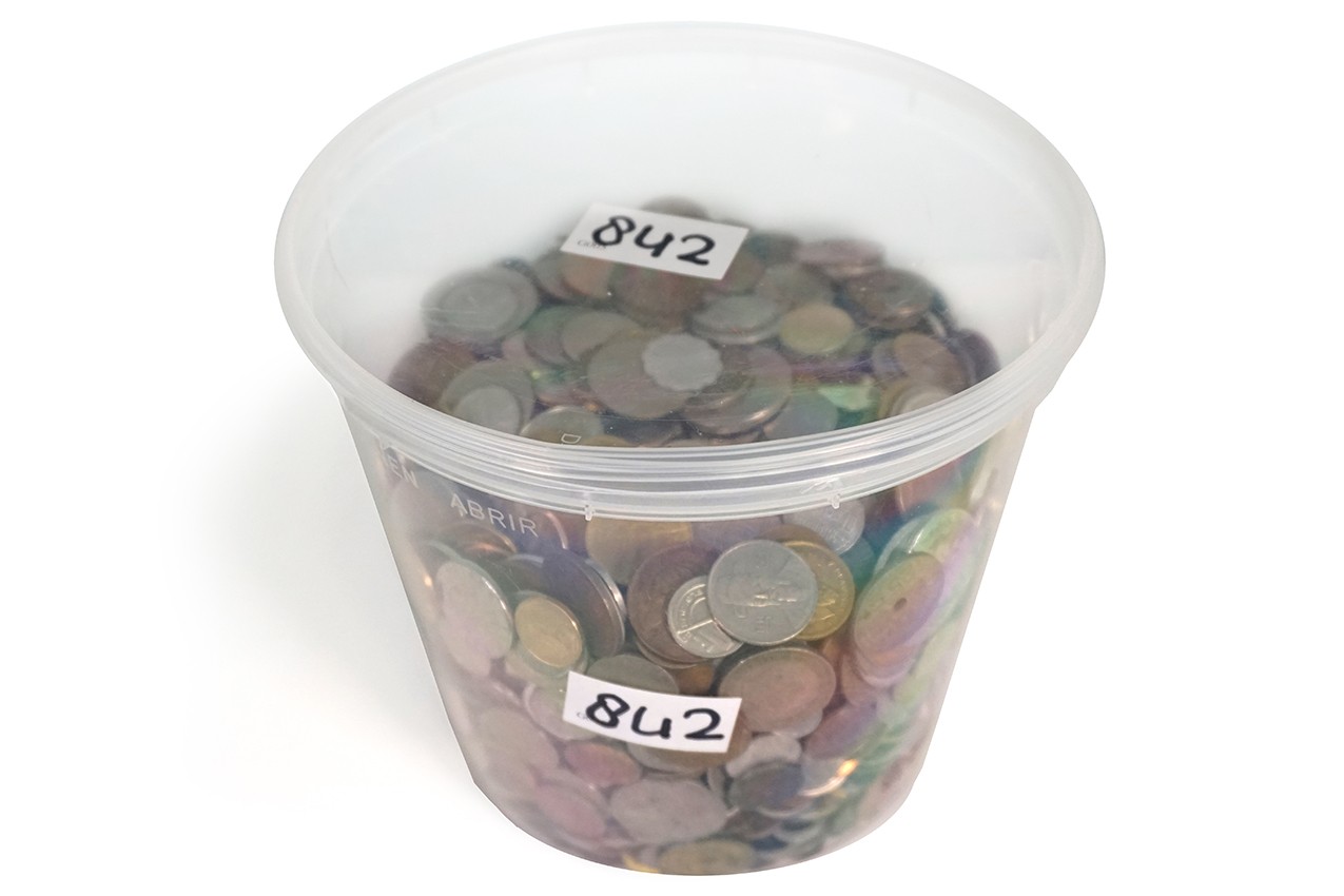 Plastic tonnetje ‘Haribo’ met 8 kg. eenvoudige wereldmunten, kilowaar.